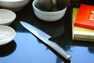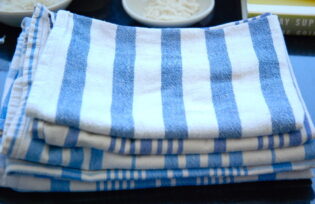 3. My favourite knife and a stack of my faded, striped blue dish towels.