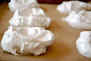 Spoon the meringue into 10 rounds that measure 3 inches wide over the two prepared baking sheets. With the back of a spoon, create an indentation in the middle of the mound to accommodate the whip cream and fruit once the meringues have been baked.
