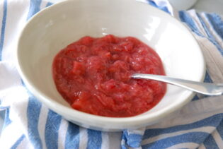 While the cake is baking place the rhubarb, sugar, and water in a heavy saucepan. Bring to a boil and reduce the heat to medium low. Simmer for approximately 15 minutes, stirring occasionally until the rhubarb is soft and beginning to fall apart. Stir in the vanilla.