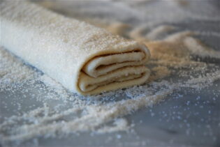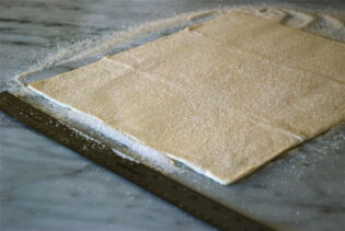 Fold the sides of the square toward the centre so they go halfway to the middle. Fold them again so the two folds meet exactly at the middle of the dough. Then fold one half over the other half as if you were closing a book. There will be six layers of pastry folded on top on one another.