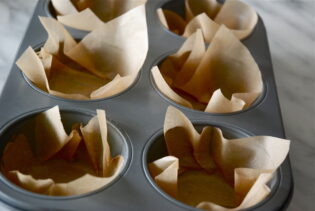 Since I never make muffins I did not have any muffin cups but did have parchment paper. I cut sheets of parchment into 5 x 5 inch squares and pressed them into the tins (thanks Martha!) which worked just fine.